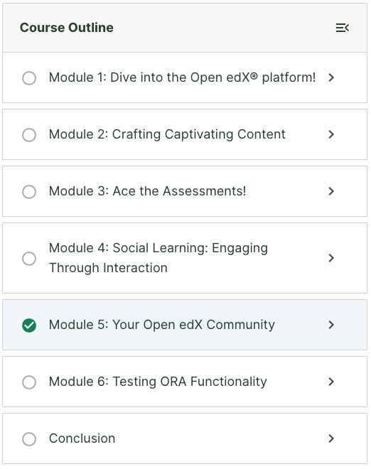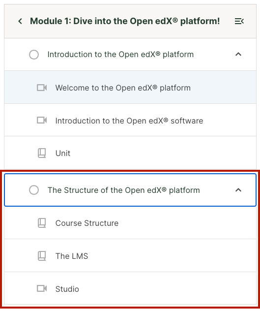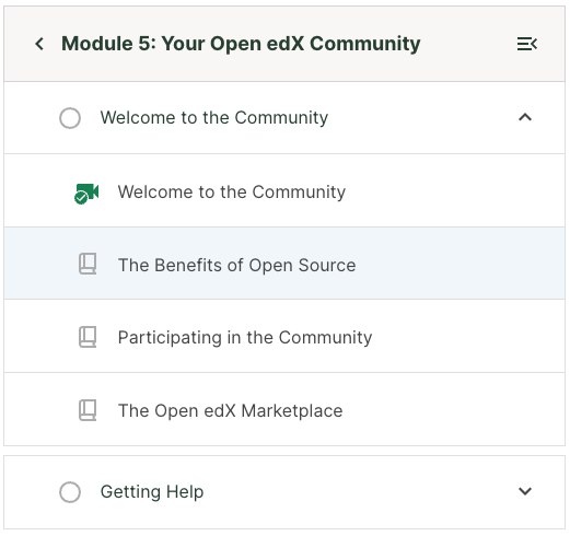 Additionally, learners can easily navigate the course non-linearly without having to go to the Course Outline page. Learners can click on any unit in the sidebar to view that unit. The sidebar displays both the unit name and an icon indicating the type of content in that unit. The idea is to give the learner a fuller sense of what content exists where in the course, so that they can navigate it in a way that makes sense for them.