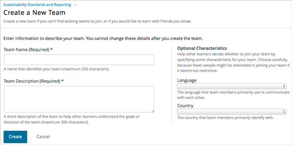 2. Optionally, add some characteristics for your team. You can specify a language that members would primarily use to communicate with each other, and a country that members would primarily identify with. Keep in mind that if your team details make the team membership seem too selective, learners might be discouraged from joining.