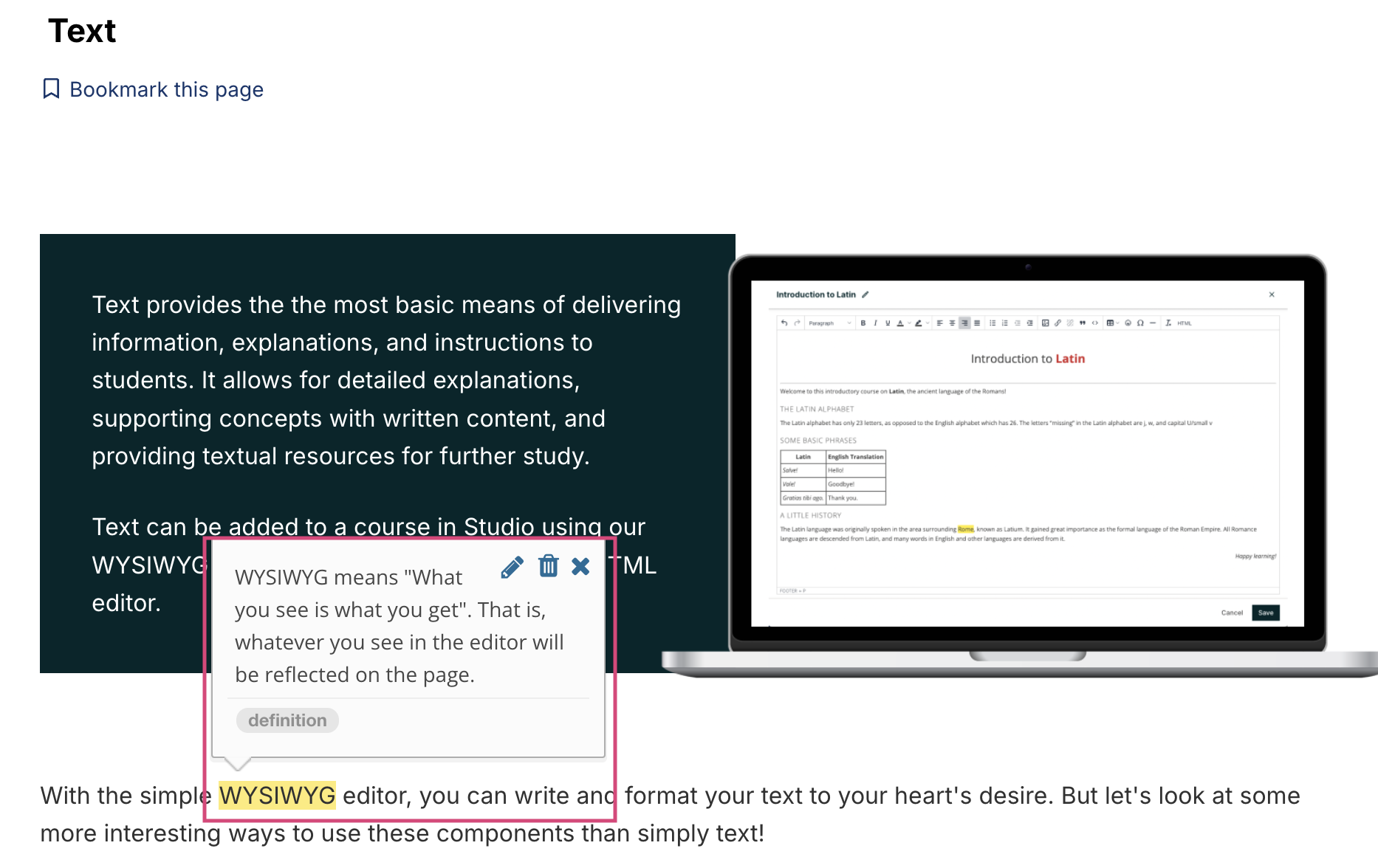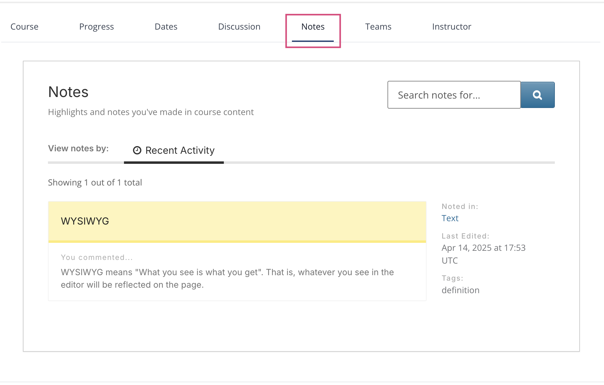 The notes tool allows learners to highlight and make notes about what they read in the body of the course.