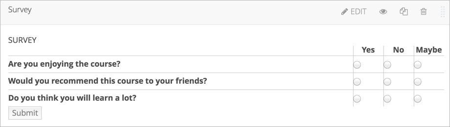 Alternatively, you can use OLX to enable the survey tool. See Create a Poll (via OLX).