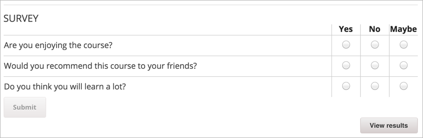 After learners submit their answers to the survey, they see the survey results that have been gathered at this time, unless the survey has been configured to hide results.