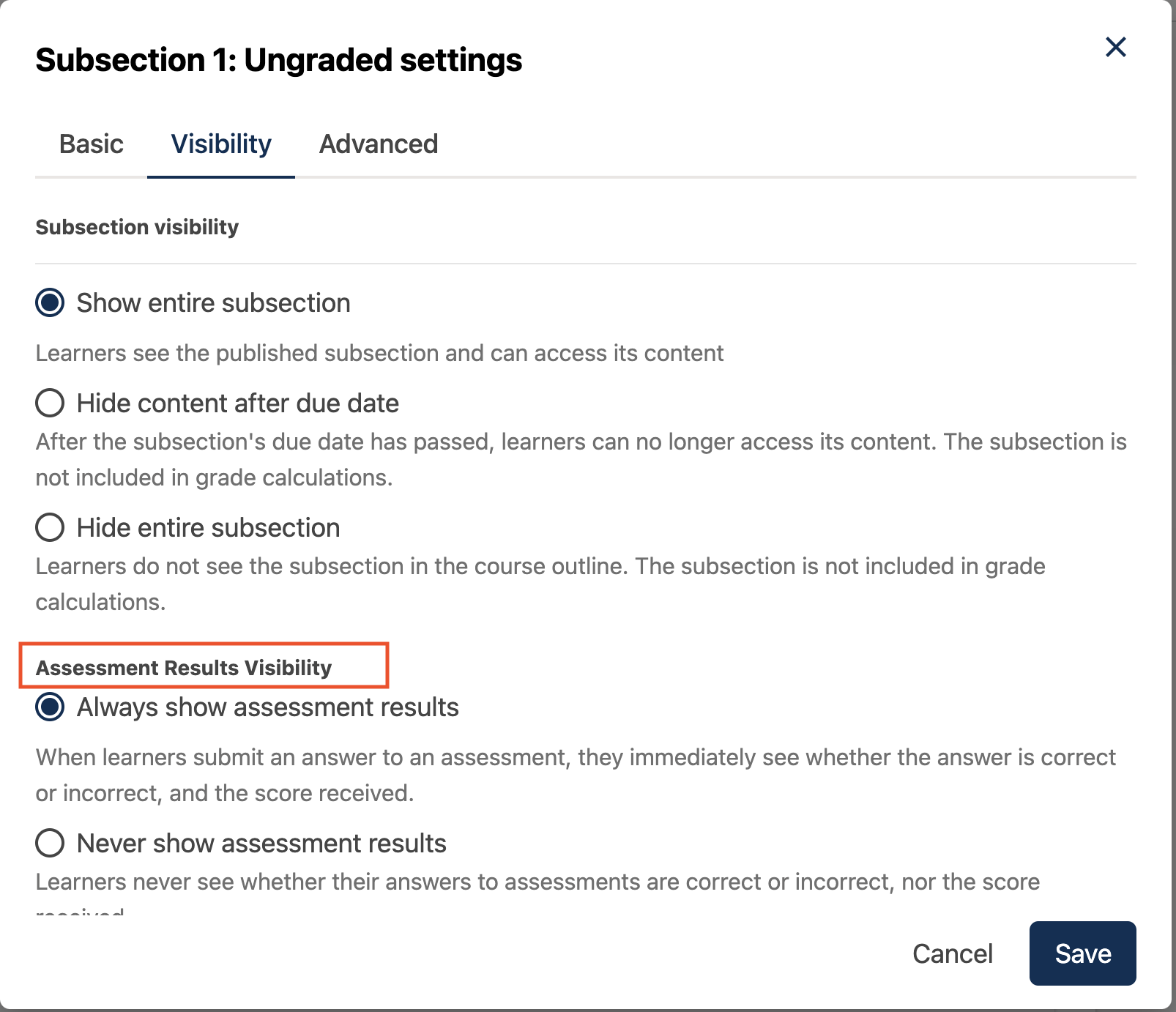 • Never show assessment results: Subsection scores are visible, but problem results are never visible to learners or to course staff. Problem scores from this subsection are not counted toward the overall course score.