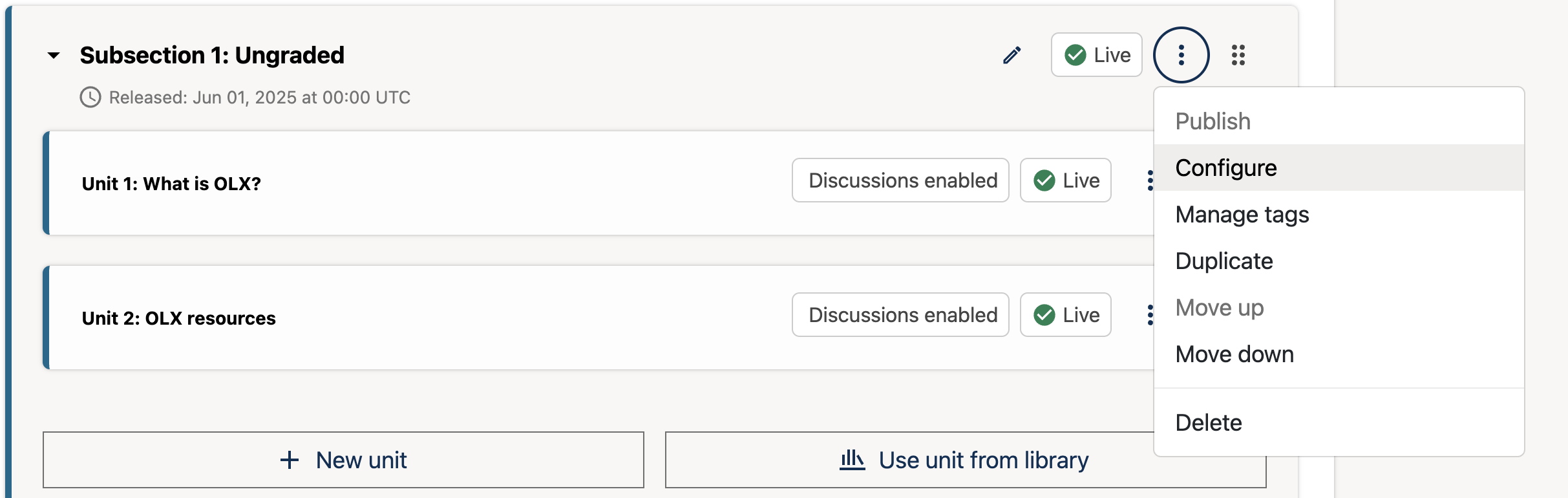 1. From the three-dot menu at the subsection level, choose Configure.