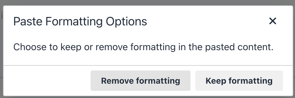 an image of the popup you will receive after copying and pasting content into the Text Editor. This popup allows you to select either keep or remove formatting.