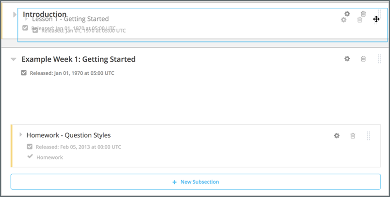 If you did not expand the section or subsection you are moving the object to, the outline of that section or subsection turns blue when you have moved the object to a valid location. You can then release the mouse button. For example, in the image below, the subsection Lesson 1 - Getting Started is being moved to the collapsed section Introduction.