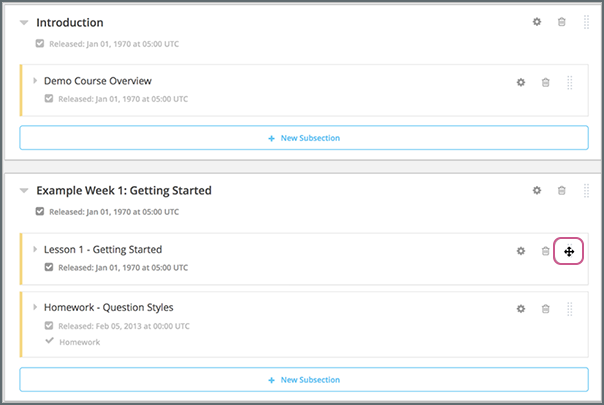 To drag a section, subsection, or unit to another position in the course outline, move your cursor over the handle on the right of the object’s box until the cursor changes to a four-headed arrow. For example, in the image below, the handle for the subsection Lesson 1 - Getting Started is selected.