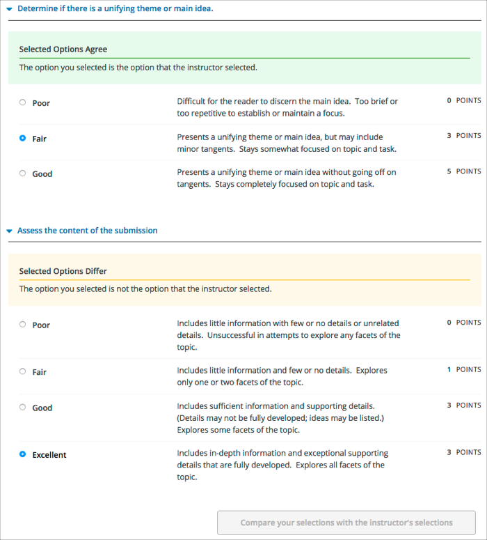 • If any option that you select is not the same as the instructor’s selection, you see the response again, with a message indicating that your assessment differs from the instructor’s assessment.