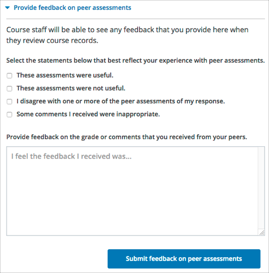 In the "Provide feedback on peer assessments" section, you can select statements or written comments as feedback on the peer scores that you received.
