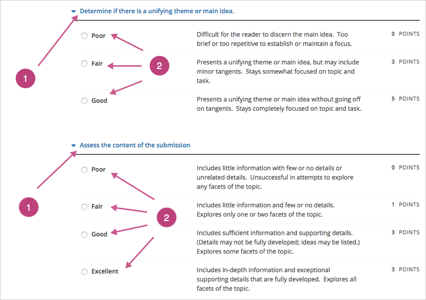 2. Options. Each criterion has options which describe how well each response satisfies the criterion. The options are usually a range of ratings, for example “Fair”, “Good”, or “Excellent”, with details to help you decide the rating.