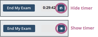 You can hide the amount of time that remains in your exam. To do this, select the icon that is located next to the timer. To show the remaining time, select the icon again.