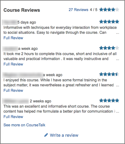The CourseTalk widget allows learners to write reviews of your course and see reviews that other learners have written. Learners can write reviews on the course Course page, and the reviews are visible both in the course, and on the course About page. Only learners who are enrolled in the course can leave reviews of a course.