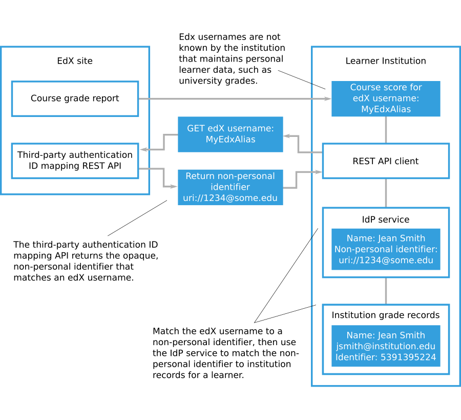 A diagram showing how an organization that uses third-party authentication can match non-personally identifying Open edX learner usernames with the records that the organization holds for those learners.